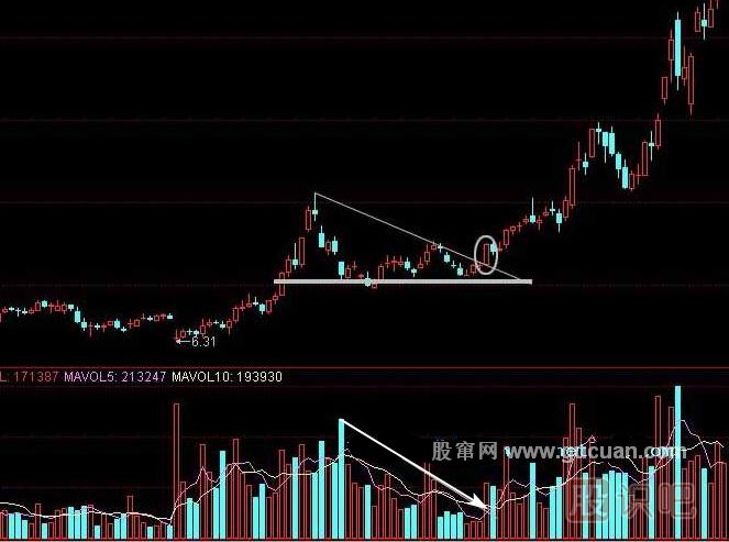 (2)上升三角形在突破頂部水平的阻力線(xiàn)時(shí),有一個(gè)短期買(mǎi)入訊號,下降三角形在突破下部水平阻力線(xiàn)時(shí)有一個(gè)短期沽出訊號。但上升三角形在突破時(shí)須伴有大成交量,而下降三角表突破時(shí)不必有大成交量來(lái)證實(shí)。