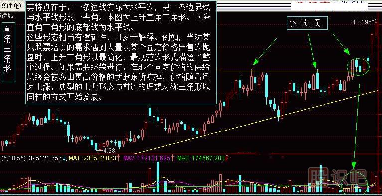 上升三角形顯示買(mǎi)賣(mài)雙方在該范圍內的較量,但買(mǎi)方的力量在爭持中已稍占上風(fēng)。賣(mài)方在其特定的股價(jià)水平不斷沽售不急于出貨,但卻不看好后市,于是股價(jià)每升到理想的沽售水平便即沽出,這樣在同一價(jià)格的沽售形成了一條水平的供給線(xiàn)。不過(guò),市場(chǎng)的購買(mǎi)力量很強,他們不待股價(jià)回落到上次的低點(diǎn),更急不及待地購進(jìn),因此形成一條向右上方傾斜的需求線(xiàn)。另外,也可能是有計劃的市場(chǎng)行為,部分人士有意把股價(jià)暫時(shí)壓低,以達到逢低大量吸納之目的。