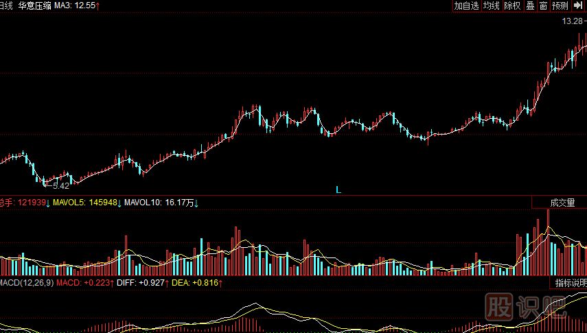 案例:如圖所示,華意壓縮(000404)在2009年9月初連續收出13根小陽(yáng)線(xiàn),3日均線(xiàn)將這些陽(yáng)線(xiàn)串成了鏈子,這是主力吸貨的信號。隨后該股股價(jià)略作回調,于10月初繼續收出一串陽(yáng)線(xiàn)。這是很明顯的吸貨征兆,投資者可在此介入,之后該股中線(xiàn)走強,股價(jià)漲了近三倍。