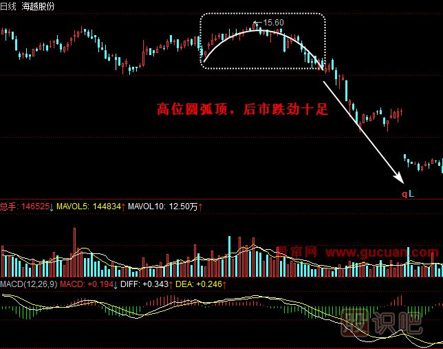 案例1:如圖所示,海越股份(600387)在2009年4月底連續收了數個(gè)漲停板,之后股價(jià)繼續走強。到2009年11月,該股最高漲至16.7元,較低位啟動(dòng)時(shí)翻了三倍,主力獲利非常豐厚,開(kāi)始想如何出貨。從2009年11月起,該股就在高位反復震蕩,漲不上去也跌不下來(lái)。2010年3月中旬,該股重新發(fā)起新一輪的上升,但這次的上升非常緩慢,漲至15.6元之后又開(kāi)始緩慢下跌,在高位構成一個(gè)像鍋蓋一樣的圓弧頂。此時(shí)如果不逃,很可能就要成為主力鍋中的菜肴了。