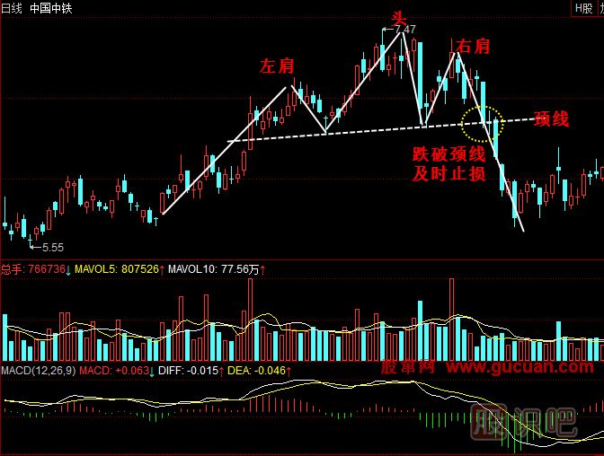 頭肩頂底是加強了的多重頂底形態(tài),因此操作上也要及時(shí)的逃頂和抄底。但頭肩頂底的形態(tài)相對雙重頂底要復雜,運行過(guò)程中暗含了多空雙方更多的博弈,因此操作的關(guān)鍵點(diǎn)是看頸線(xiàn)(如上圖的虛線(xiàn)處),突破頸線(xiàn)則預示頭肩頂底成形,此時(shí)再操作,能夠極大提高自己的準確度。