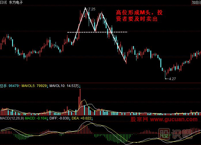 案例2:如圖所示,在前幾日連續漲停之后,東方電子(000682)2010年4月2日跳空高開(kāi)高走,之后的幾天股價(jià)繼續強勢沖高,然后開(kāi)始下跌,接下來(lái)股價(jià)再次走強又再次下跌,在高位形成了“M”形走勢。此時(shí)投資者不宜過(guò)早介入,短線(xiàn)獲利的投資者也應當落袋為安。