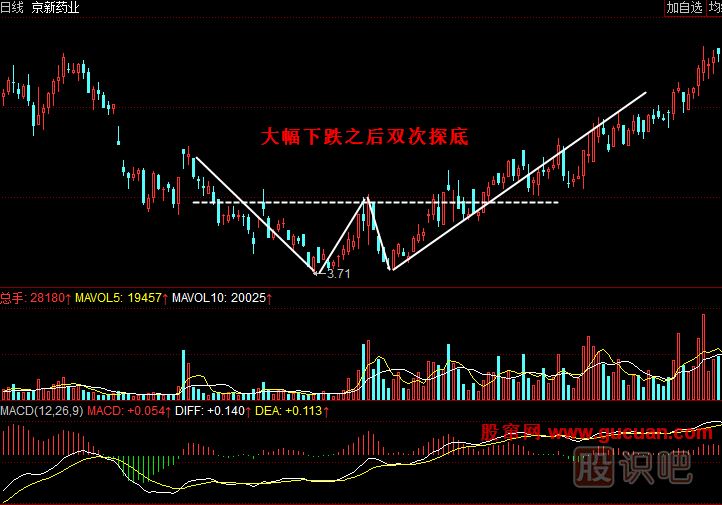 案例1:如圖所示,2008年10月13日,京新藥業(yè)(002020)在經(jīng)過(guò)較長(cháng)一段時(shí)間的大跌之后于3.71元見(jiàn)底,在經(jīng)過(guò)短期反彈之后再次探底。股價(jià)跌到3.71元附近時(shí)止跌,然后重新走強。兩次探明底部后股價(jià)繼續上漲,走勢上形成了W底的走勢,伴隨著(zhù)成交量的放大——顯示出有大量資金入場(chǎng)抄底——此時(shí)投資者便可以順勢買(mǎi)入。