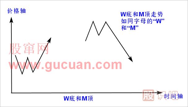 W底的K線(xiàn)圖形如同字母“W”,出現在股價(jià)下跌之后的低位區;M頂則出現在股價(jià)上漲之后的高位區,圖形如同字母“M”。W和M圖形股價(jià)出現兩次低點(diǎn)和高點(diǎn),因此又被稱(chēng)為雙重底和雙重頂。具體圖形如圖所示(圖中K線(xiàn)連續用直線(xiàn)表示)
