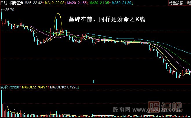 這兩根K先就形成了一組高位的死亡墓碑。前面這把“錘子”用力地(放量)刻出后面這座高高的墓碑,這是主力向散戶(hù)索命的標志。如果投資者不學(xué)習基本知識,此時(shí)追進(jìn)去,就如同自告奮勇跳入刀山火海,最后死無(wú)葬身之地!