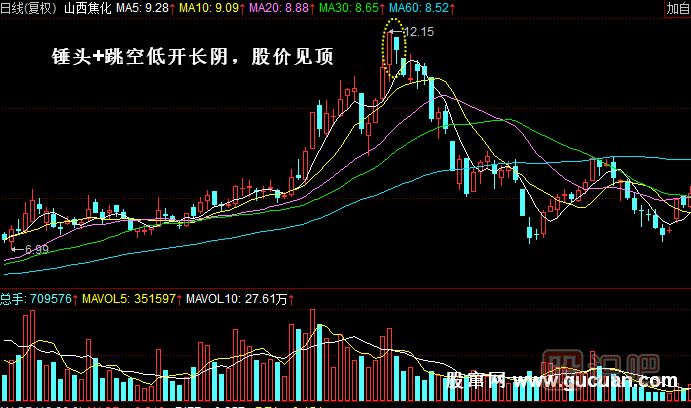 實(shí)例2:如圖所示,2009年8月5日,山西焦化(600740)經(jīng)過(guò)連續三根大陽(yáng)線(xiàn)的上漲之后,收出一根陰錘頭線(xiàn),此時(shí)多方已成強弩之末,