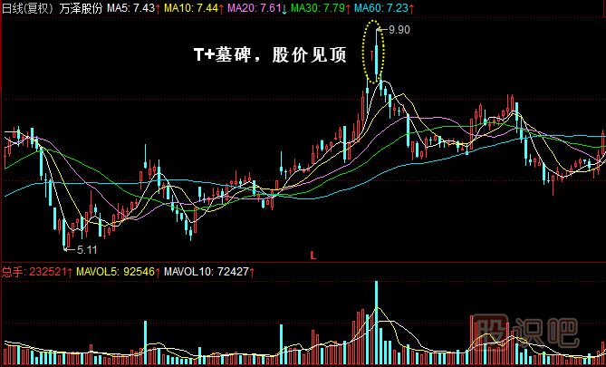 3.死亡墓碑K線(xiàn)組合變異為T(mén)+陰線(xiàn)時(shí)是見(jiàn)頂信號,部分個(gè)股短期殺跌后略有反彈。