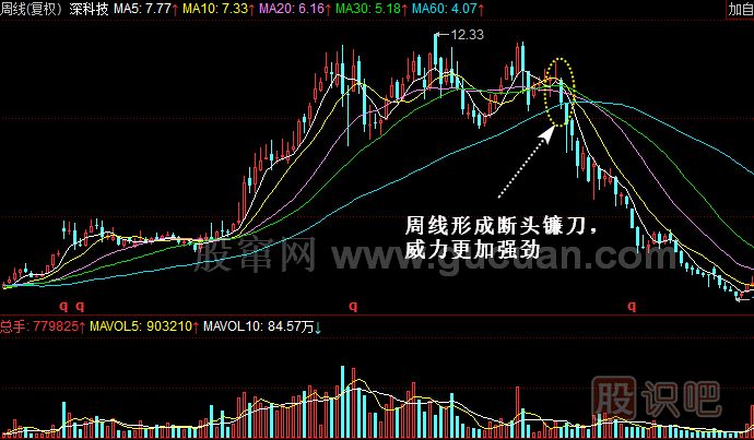 斷頭鐮刀,往往是需要逃命的征兆,它并不會(huì )因為股價(jià)處于盤(pán)整區而降低風(fēng)險。同時(shí)斷頭鐮刀代表的是一種K線(xiàn)類(lèi)型,特征是單根大陰線(xiàn)斬斷所有均線(xiàn)的支撐,斷頭鐮刀不僅僅用于單日跌穿多條日均線(xiàn),也可用于周線(xiàn)、月線(xiàn)等周期的研判。