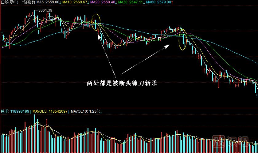 4.斷頭鐮刀K線(xiàn)組合是明顯的賣(mài)出信號,投資者切莫抱有幻想。