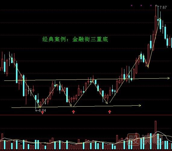 三重底。除了每個(gè)最低點(diǎn)均處于同一價(jià)位之外,與頭肩底相似。它是三重頂的鏡像,只是在向上突破時(shí)成交量更加重要。
