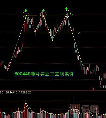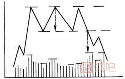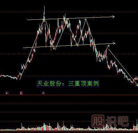 三重頂。除了所有的波峰都處在同一價(jià)位之外,與頭肩形相似。每個(gè)上升行情的波峰應伴隨較少的成交量。當市場(chǎng)放量跌破兩個(gè)波谷時(shí)形態(tài)完成。測算技法是從突破點(diǎn)向下投射形態(tài)的高度。反抽下面一根直線(xiàn)的現象并不少見(jiàn)。