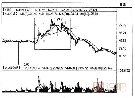 上圖頭肩頂形態(tài)出現在某只股票的日線(xiàn)圖上,該股價(jià)格在頭肩頂形態(tài)之前的一段時(shí)間里帶量上行,價(jià)格推動(dòng)出現第一個(gè)明顯的波峰A;隨后,在成交量的逐步萎縮之下,價(jià)格回落到B點(diǎn);在較高的成交量配合下,價(jià)格創(chuàng )出8.15元的新高,形成了頭部;從8.15元開(kāi)始,股價(jià)回落到D點(diǎn)(注意此時(shí)成交量也隨之萎縮)。市場(chǎng)從D點(diǎn)開(kāi)始上行至E點(diǎn),無(wú)力沖擊8.15元的頭部高位,形成右肩。在該頭肩頂形成過(guò)程中,成交量配合也相當完美。最后,股價(jià)也向上回抽,考驗頸線(xiàn)的有效性,但價(jià)格在G點(diǎn)處打住,并沒(méi)有回到頸線(xiàn)B-D之上,股價(jià)隨之輾轉而下。