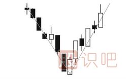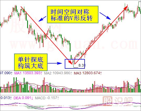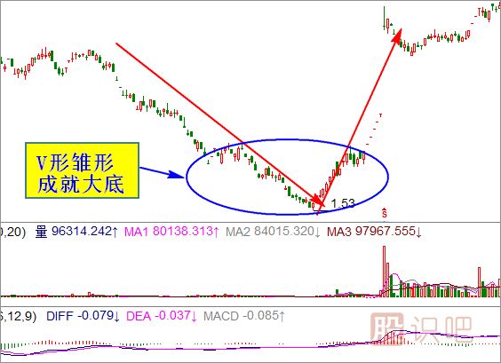 在一波下跌行情的末段,市場(chǎng)中的悲觀(guān)情緒明顯升溫,股價(jià)加速下行,基本呈自由落體下跌,新低連接出現,恐慌盤(pán)不斷涌出。就在這時(shí),該股于某日突然止跌反彈,形成了一個(gè)尖底。接下來(lái)的數個(gè)交易日里,久違了的買(mǎi)盤(pán)紛紛進(jìn)場(chǎng)拉升股價(jià),使股價(jià)迅速脫離底部,并且股價(jià)單邊上漲,拒絕回調,股價(jià)上升的角度與加速下跌時(shí)正好對稱(chēng),做多的力度也與此前空方的打壓力度基本相等。從走勢上看,急跌急漲的過(guò)程在K線(xiàn)圖上留下了一個(gè)大大的V字形運行路線(xiàn),V形底因此得名。(如圖)