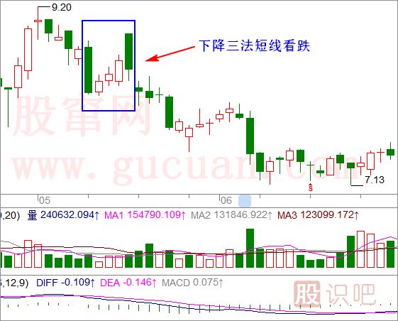 下降三法組合一般出現在行情下跌的過(guò)程當中。出現大陰線(xiàn)之后,雖然連續拉出三根小陽(yáng)線(xiàn),但這只是對短線(xiàn)過(guò)急下跌速率的修正,因此反而是逢高減倉的好機會(huì ),因為整個(gè)跌勢仍未完結,空方馬上會(huì )重新發(fā)難。在成交方面的變化,該組合遠不如上升三法組合表現得明顯。