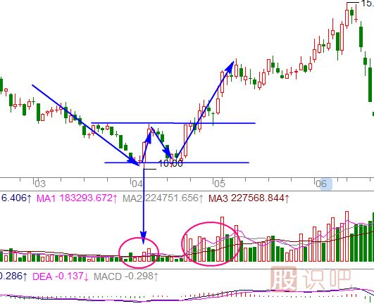 4.雙底中第二個(gè)底部成交量十分小,但在突破頸線(xiàn)時(shí)必須得到成交量放大的配合方可確認。