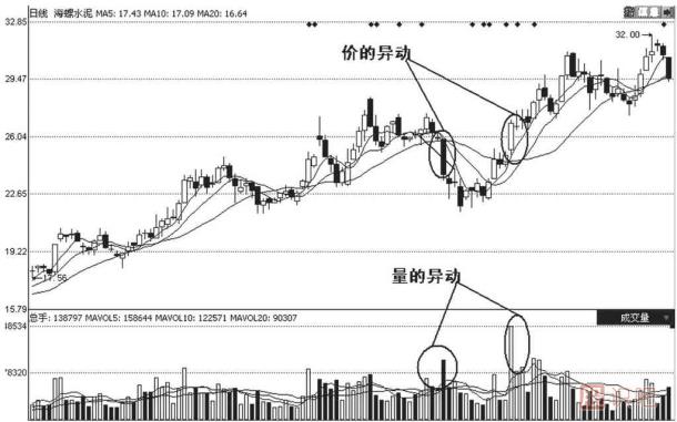 以海螺水泥(600585)的股價(jià)走勢圖為例來(lái)說(shuō)明異動(dòng)股的圖譜表現形式。如圖3-43中左側橢圓標示的位置,在股價(jià)緩慢上升的途中,突然某天拉出一個(gè)大陽(yáng)線(xiàn)配以巨量的成交量,或者在股價(jià)下降的途中,成交量一直處于萎靡甚至縮量的形態(tài),在某天突然出現一個(gè)巨量(如右面的圓圈)處,這都屬于從該股中捕捉到的異動(dòng)情況。此外,判斷個(gè)股異動(dòng)的情況的方法還有: