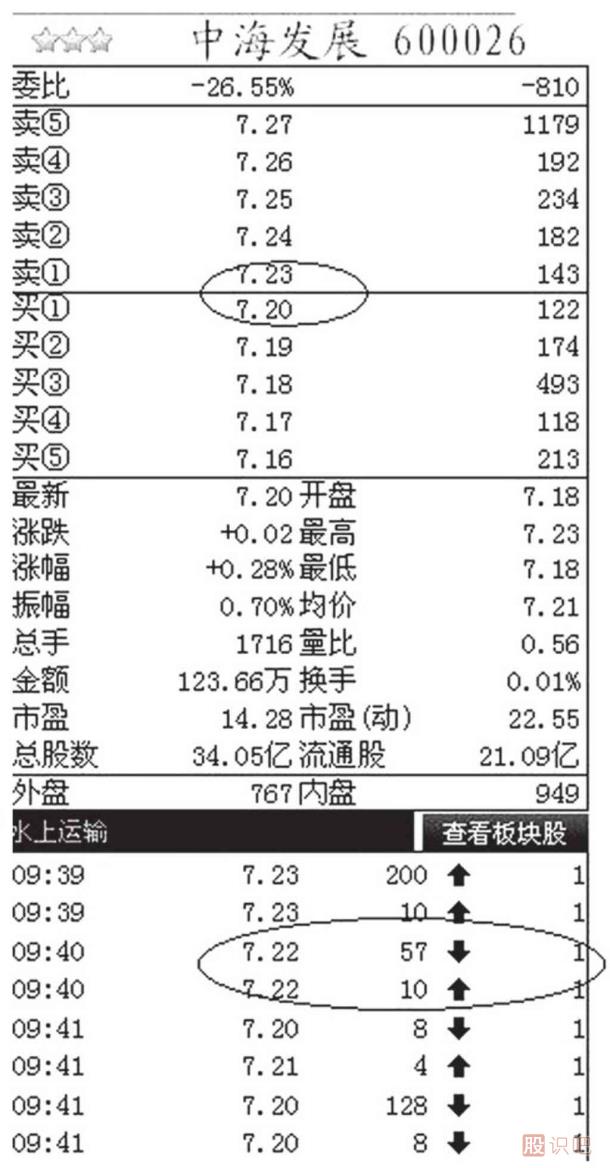 圖3-41就是中海發(fā)展(600026)在2011年11月11日星期五下午9:46時(shí)的盤(pán)口。該股買(mǎi)①到買(mǎi)⑤的價(jià)格為7.16?7.20元,賣(mài)①到賣(mài)⑤的價(jià)格分別為7.23?7.27元。但是,可以在上圖的盤(pán)口中明顯地看出,該股票在9:40的時(shí)候分別出現了57手和10手以7.22元成交的買(mǎi)盤(pán)和賣(mài)盤(pán),這就是隱性買(mǎi)賣(mài)盤(pán)。