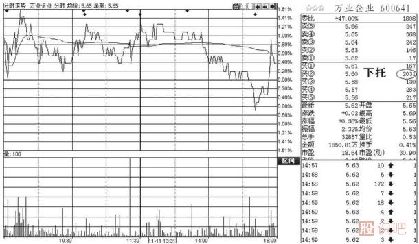 圖3-3就是萬(wàn)業(yè)企業(yè)(600641)在2011年11月11日收盤(pán)時(shí)的盤(pán)口。買(mǎi)②掛2031手,而賣(mài)單都是幾百手,屬于下托板的情況。