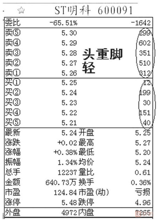 圖3-2就是ST明科(600091)在2011年11月11日收盤(pán)時(shí)的盤(pán)口。賣(mài)①到賣(mài)⑤都是過(guò)300手的大單,買(mǎi)①到買(mǎi)⑤均為100手左右的小單,屬于上壓板的情況。