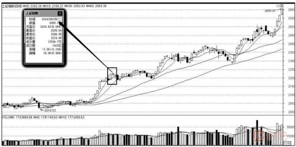 2014年8月5日,大盤(pán)形成身懷六甲K線(xiàn),之后大盤(pán)一路上漲到3200點(diǎn)。