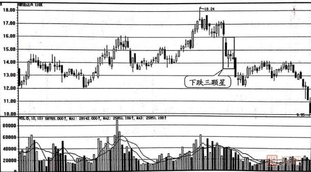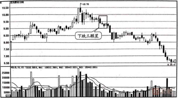 (1)下跌三顆星K線(xiàn)組合的第一根陰線(xiàn)如果屬于放量長(cháng)陰線(xiàn),同時(shí)剛好在股價(jià)形成頭部破位時(shí)出現,隨后三根并排的小K線(xiàn)均為小陰線(xiàn)實(shí)體,且小陰線(xiàn)的成交量極度萎縮,這多數代表股價(jià)頭部已經(jīng)形成,后市股價(jià)往往會(huì )有較大跌幅。