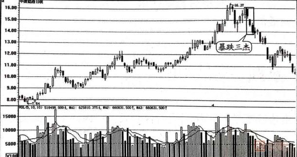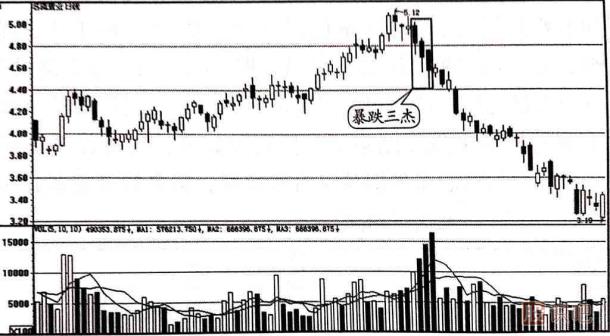 (1)暴跌三杰的標準形態(tài)在實(shí)際走勢中一般難以見(jiàn)到,多數為非標準形態(tài),主要是三根陰線(xiàn)K線(xiàn)實(shí)體之間的長(cháng)短不是沒(méi)有達到應有的長(cháng)度,就是排列組合不夠規范。但這些不規范的暴跌三杰見(jiàn)頂信號的強烈程度,不比標準的暴跌三杰要差。
