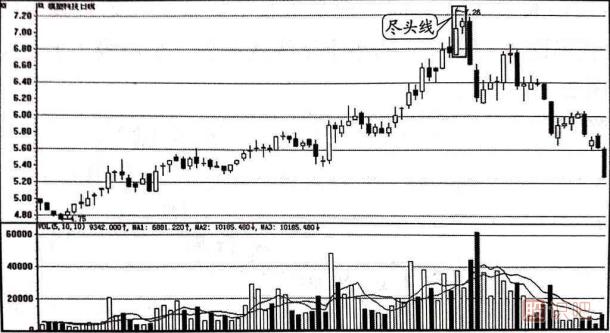 盡頭線(xiàn)是一種頂部轉勢的信號。在行情的上漲趨勢中,一般都認為這個(gè)趨勢會(huì )繼續運行下去,但是在一根陽(yáng)線(xiàn)的長(cháng)上影線(xiàn)右方,卻出現了一根完全涵蓋在上影線(xiàn)范圍內的短十字線(xiàn)或小陽(yáng)、小陰線(xiàn),則預示著(zhù)股價(jià)將要轉勢下跌。 頂部盡頭線(xiàn)中第二根K線(xiàn)越小,則轉勢的信號越強烈。 標準的盡頭線(xiàn)出現的機會(huì )并不多,而大多數情況下出現的都是不太標準的盡頭線(xiàn),這種不太標準的盡頭線(xiàn)所發(fā)出的股價(jià)轉向信號對投資者同樣有相當大的參考價(jià)值。 只要是盡頭線(xiàn),不論形態(tài)是否標準,投資者都要密切加以關(guān)注。 在漲勢中出現盡頭線(xiàn),不應再盲目看多,可在股價(jià)下跌時(shí)及時(shí)賣(mài)出股票。