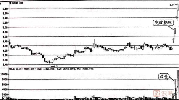 突破整理是指股價(jià)在經(jīng)過(guò)一波上漲后,在一定的上下區間內進(jìn)行橫盤(pán)整理,突然有一天走勢圖中出現一根明顯放量的大陽(yáng)線(xiàn)一舉突破整理區間高點(diǎn),形成新一波的漲勢行情,如圖1-3所示。接下來(lái)由股識吧來(lái)給您議單根K線(xiàn)突破整理買(mǎi)入,不明白的就來(lái)看看。