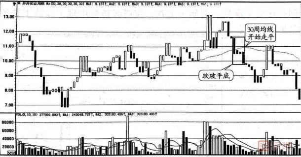 跌破平底是指股價(jià)經(jīng)過(guò)長(cháng)時(shí)間的大幅上漲(一般漲幅要求超過(guò)50%)后,寶塔線(xiàn)指標在30周均線(xiàn)上方出現跌破平底,即最后一周的K線(xiàn)收盤(pán)價(jià)跌破了前周的收盤(pán)價(jià),如圖1-9所示。接下來(lái)由股識吧來(lái)探究寶塔線(xiàn)指標跌破平底賣(mài)出,大伙兒一起看文章內容。