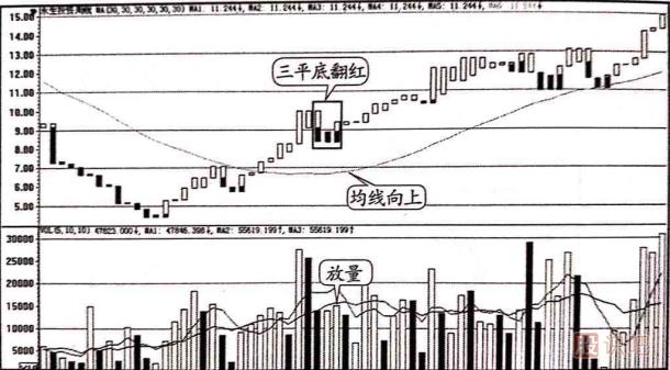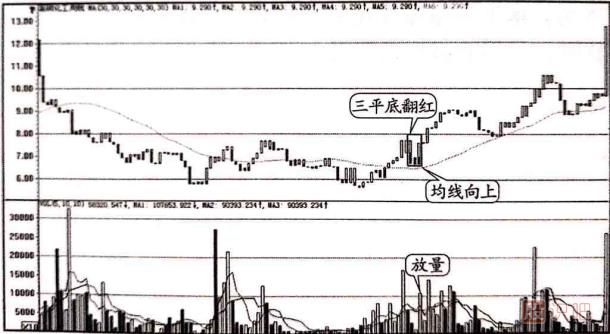 三平底翻紅是指在周K線(xiàn)中,當股價(jià)經(jīng)過(guò)長(cháng)時(shí)間的大幅下跌(一般跌幅要求超過(guò)50%以上)后,30周均線(xiàn)開(kāi)始走平或緩緩向上,寶塔線(xiàn)指標在30周均線(xiàn)上方出現第一次三平底翻紅,即在連續的三個(gè)周K線(xiàn)中,后兩周的最低價(jià)沒(méi)有超過(guò)第一周的最低價(jià),而最后一周的收盤(pán)價(jià)超過(guò)第二周的開(kāi)盤(pán)價(jià),并且成交量比前周成交量出現明顯放大,如圖1-1所示。接下來(lái)由股識吧來(lái)來(lái)聊寶塔線(xiàn)指標三平底翻紅買(mǎi)入,由小編為大家分析一下。