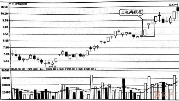 上漲兩顆星屬于常見(jiàn)的上漲中繼形態(tài),一般出現在大行情的初期。 大陽(yáng)線(xiàn)之后連續出現勢均力敵的信號意味著(zhù)多空雙方的力量在新的條件下取得了平衡,空方?jīng)]有打壓股價(jià)的力量,多方的勝利被鞏固了,投資者對股價(jià)的上漲已經(jīng)取得了共識,大陽(yáng)線(xiàn)取得的成果已經(jīng)得到市場(chǎng)的認同,這往往是股價(jià)大幅度攀升的先兆。