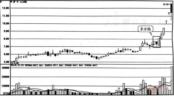 如圖1-20所示的是羅牛山(000735)的日k線(xiàn)走勢圖。 該股從前期低點(diǎn)4.86元開(kāi)始止跌企穩,然后股價(jià)在底部進(jìn)行橫向整理,隨后股價(jià)向上運行,在圖中所示的方框內出現了多方炮的K線(xiàn)組合。 該組合中第一天是一根小陽(yáng)線(xiàn),第二天收出了一根小陰線(xiàn),當天成交量明顯萎縮,第三天股價(jià)收出一根光頭的大陽(yáng)線(xiàn),成交量明顯放大。 在這個(gè)位置出現的多方炮意味著(zhù)股價(jià)在進(jìn)行上漲前,主力經(jīng)過(guò)一次小幅洗盤(pán)的過(guò)程,即將開(kāi)始發(fā)動(dòng)強勢地拉升行情,是明顯的買(mǎi)人信號。后市股價(jià)出現快速的上漲,股價(jià)短期漲幅驚人。