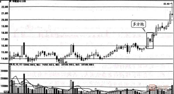 (2)多方炮的K線(xiàn)組合中陰線(xiàn)的底部越高,實(shí)體越短,上漲的力量越強。