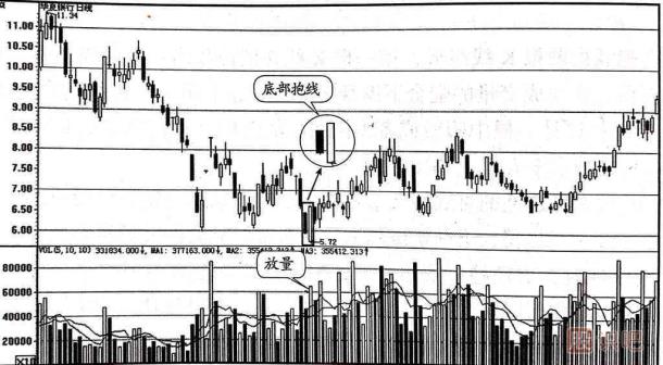 如圖1-2所示的是華夏銀行(600015)的日k線(xiàn)走勢圖。 該股從前期的高點(diǎn)11.34元開(kāi)始下跌,在圖中所示的方框內第一根K線(xiàn)處收出一根幾乎光頭光腳的中陰線(xiàn),第二天收出一根幾乎是光頭光腳的大陽(yáng)線(xiàn),將第一天的中陰線(xiàn)完全吞沒(méi),從而形成了抱線(xiàn)的K線(xiàn)組合。 仔細分析這兩根K線(xiàn),可以發(fā)現,首先,這個(gè)抱線(xiàn)出現在股價(jià)的大幅下跌50%之后,然后,中陰線(xiàn)和大陽(yáng)線(xiàn)的實(shí)體的長(cháng)度相差雖然不是非常懸殊,但是第二根大陽(yáng)線(xiàn)處的成交量已經(jīng)開(kāi)始放大。 綜合分析可以得出多方主力已經(jīng)開(kāi)始發(fā)動(dòng)行情的結論,所以,投資者應及時(shí)買(mǎi)入股票,后面會(huì )有一輪上升行情。