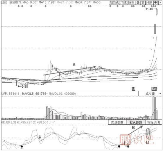 股票交易的技術分析芻議主力拉升時期的KDJ指標形態(tài)分析-三線向上發(fā)散J線快速上行形態(tài)