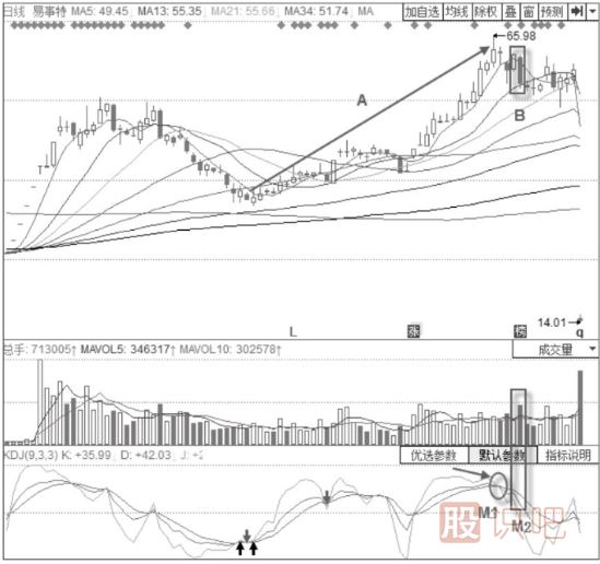 股票走勢(shì)的技術(shù)分析解說(shuō)KDJ指標(biāo)+島形頂K線圖形態(tài)的賣(mài)出技巧