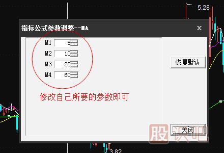 首先,鼠標左鍵雙擊K線(xiàn)走勢圖,屏幕出現十字線(xiàn)。 然后,鼠標右鍵點(diǎn)擊看盤(pán)軟件左上方所顯示的MA參數(如圖所示)