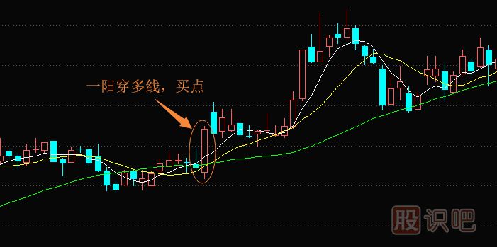 股價(jià)橫盤(pán)整理一段時(shí)間后,其多條均線(xiàn)往往會(huì )持續糾在一起。此時(shí)如果出現一根長(cháng)陽(yáng)線(xiàn),一舉向上穿越多條均線(xiàn),就形成了一陽(yáng)穿多線(xiàn)的形態(tài)。