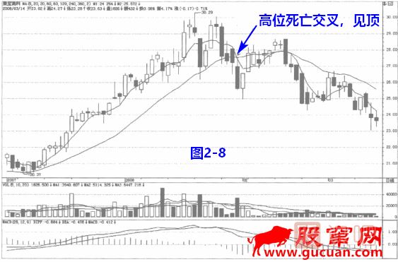 見(jiàn)圖2一8,股價(jià)經(jīng)過(guò)長(cháng)期的上漲,已出現明顯的滯漲行情,此時(shí)出現均線(xiàn)死亡交叉,要引起重視,下跌后股價(jià)無(wú)力冉向上拉起,投資者應果斷離場(chǎng),將前期所賺的利潤先落袋為安的好。