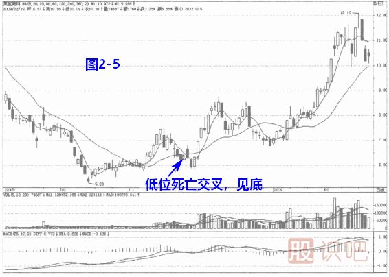 見(jiàn)圖2一5,股價(jià)經(jīng)過(guò)長(cháng)期的下跌,已初現企穩跡象,在一次強勢上漲后回落,走出死亡交叉,股價(jià)已處在相對低位,并且多方力量已見(jiàn),空方最后的力量快被耗盡,投資者可擇機人場(chǎng)。