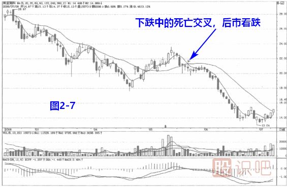 見(jiàn)圖2一7,股價(jià)處在長(cháng)期下跌中,股價(jià)略有反彈,卻再度向下,形成均線(xiàn)死亡交叉,投資者可擇機出局。