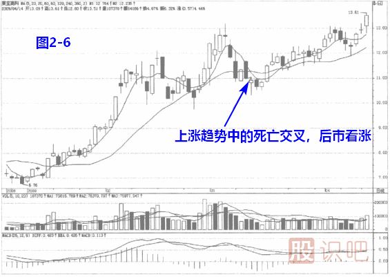 (2)上漲趨勢中均線(xiàn)死亡交叉,后市看漲,擇機入場(chǎng)。