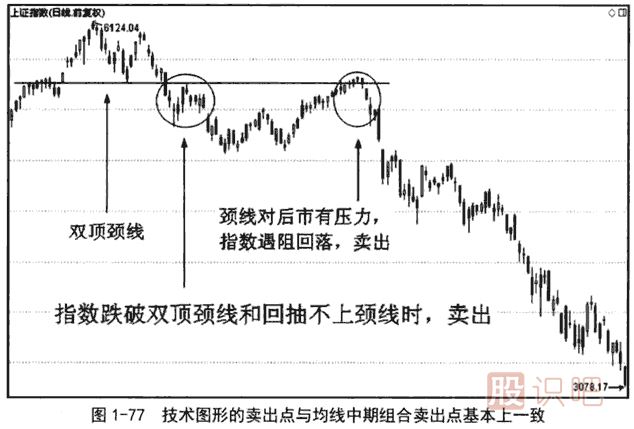 圖1-77是與圖1-76同一時(shí)間段的日線(xiàn)圖。在圖1-76中,跌破60日均線(xiàn)的大陰線(xiàn)同時(shí)也跌破了雙頂的頸線(xiàn)。雙頂是轉勢技術(shù)圖形,有效跌破頸線(xiàn)應賣(mài)出。跌破雙頂頸線(xiàn)后又回抽了一下頸線(xiàn),回抽頸線(xiàn)不上,應當繼續賣(mài)出。