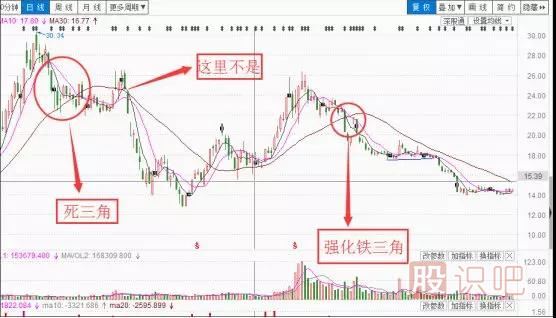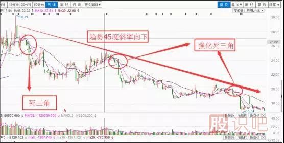 1、防范30日均線(xiàn)仍在下跌之中運行時(shí)出現的“死、強化死三角形”;這時(shí)“強化三角”的位置通常低于“死三角”的位置;