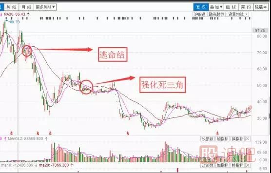 在操作中遇到的情況是多種多樣的,如5日、10日、30日均線(xiàn)沒(méi)有形成“死三角”或“強化死三角”而是‘三線(xiàn)’死叉于一點(diǎn),構成一個(gè)星,如果這個(gè)星出現在“死三角”的位置,可稱(chēng)其為‘逃命結’,若出現這種情況大家就要謹慎考慮了。