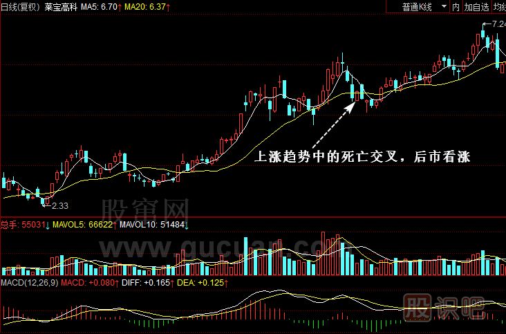 2.上漲趨勢中均線(xiàn)死亡交叉,后市看漲,擇機入場(chǎng)。