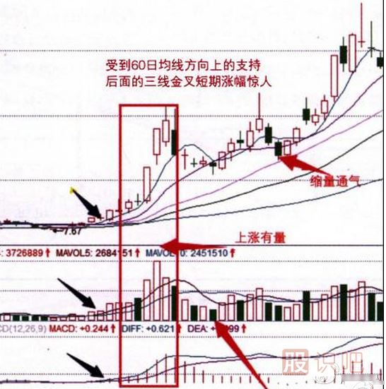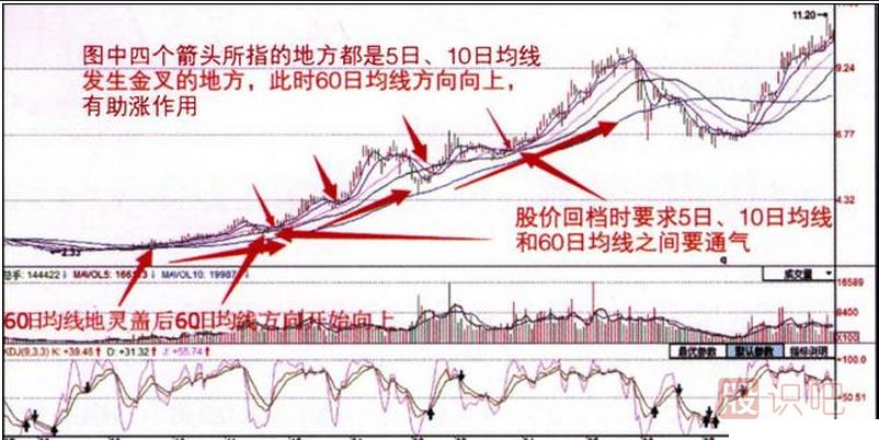 (1)當5日、10日均線(xiàn)金叉時(shí),如果60日均線(xiàn)方向也向上時(shí)就有助漲作用。