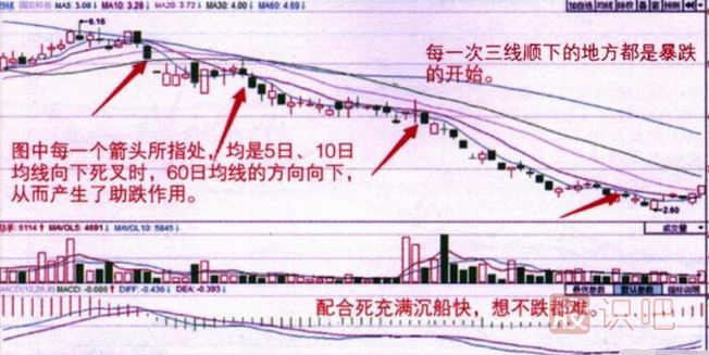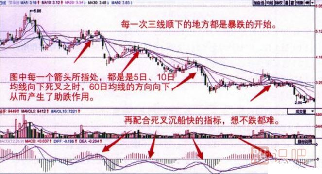 4、還有一個(gè)要注意的原則就是:三線(xiàn)順下時(shí)往往是暴跌的開(kāi)始。