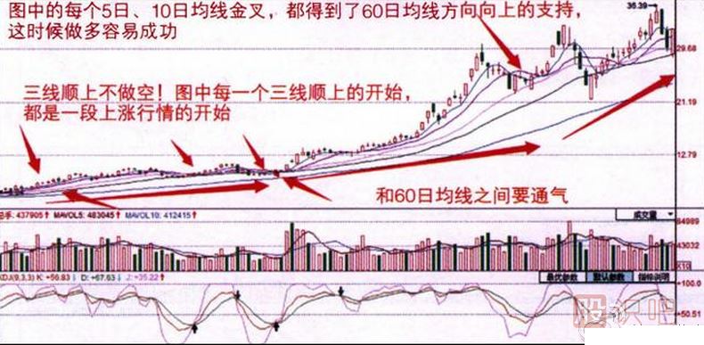 1、5日、10日均線(xiàn)顯示股價(jià)短期趨勢。隨著(zhù)股價(jià)小幅度波動(dòng),5日、10日均線(xiàn)會(huì )不斷地產(chǎn)生黃金交叉或死亡交叉。其中有個(gè)別黃金交叉具有底部意義,個(gè)別死亡交叉具有頂部意義。而大量的交叉只能是股價(jià)變化的中途狀態(tài)。為了找出其中有底部意義的那個(gè)黃金交叉或者有頂部意義的那個(gè)死亡交叉,需要引進(jìn)代表中、長(cháng)期趨勢的60日均線(xiàn)。