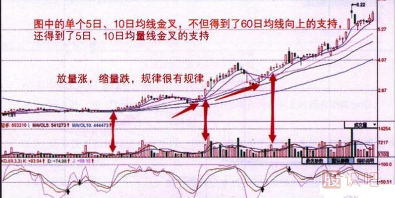 3、當5日、10日均線(xiàn)黃金交叉向上時(shí),代表10日內平均買(mǎi)入的人已有盈利,這樣可以吸引短線(xiàn)的投資者入市。如果此時(shí)60日均線(xiàn)在該黃金交叉之下,代表此時(shí)60日均線(xiàn)處買(mǎi)入的人各有盈利,此時(shí)可吸引中、長(cháng)線(xiàn)的投資者入市,這樣對股價(jià)有助漲作用;反之,有助跌作用。